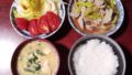納豆、明太子、サラダ、ごはん、みそ汁