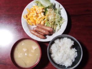 スクランブルエッグ、ソーセージ、サラダ、ごはん、みそ汁
