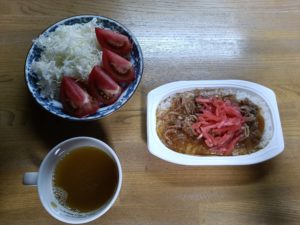 買ってきて、メインは保存食のパックご飯と牛丼の具で食べました。