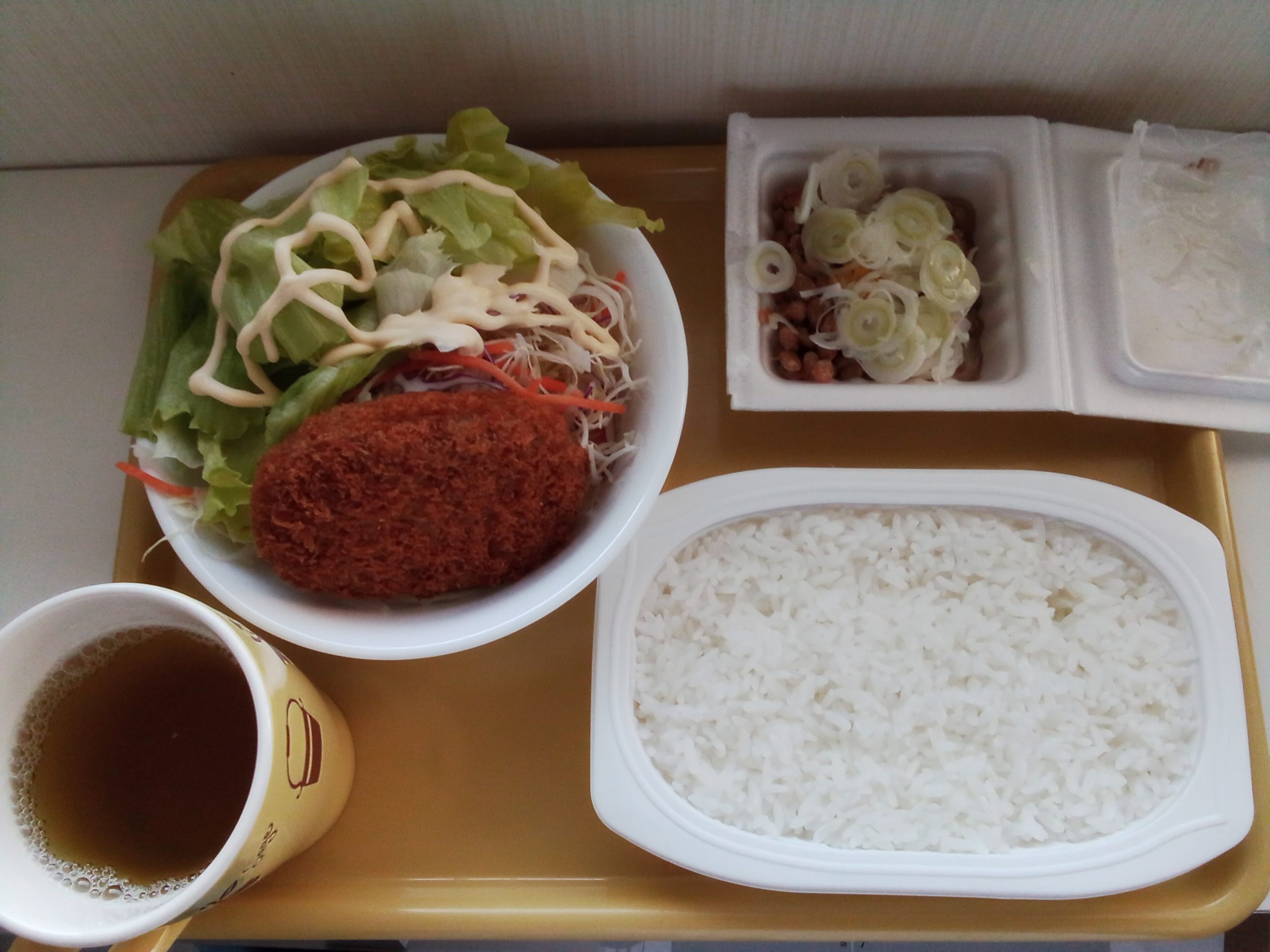 ※お昼のサラダチキンがコロッケに変わっただけに見えますが、サラダがレタスのみから