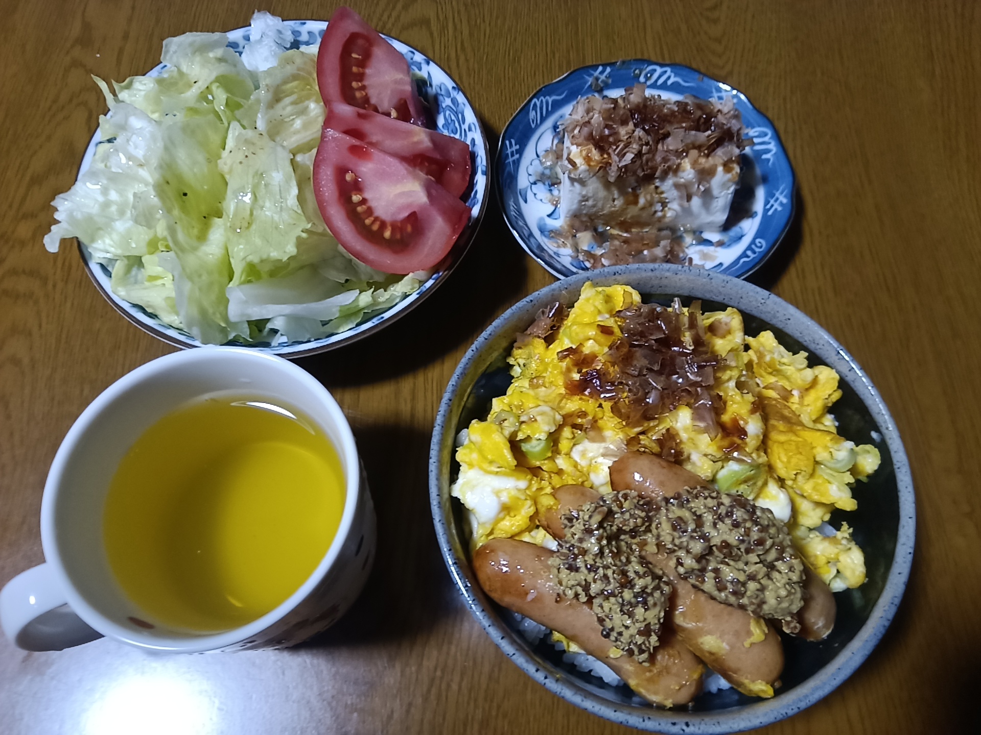 ※買い置きしてあったウインナーを見つけたので、二色丼にしました。