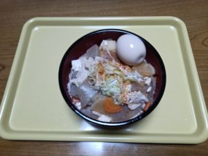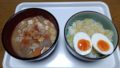 あった豚汁をつけ汁にした豚汁そうめんにして食べました。味玉もトッピングして